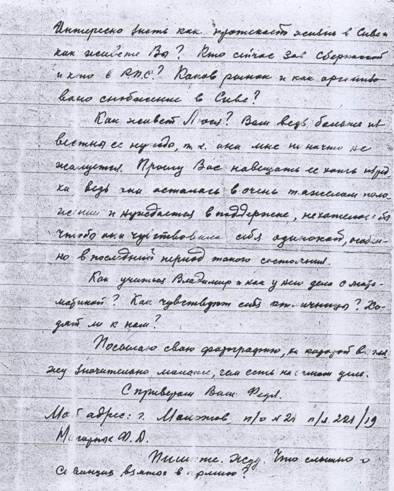« Я все еще не там , где следовало бы быть . В такие грозные дни . Очевидно , буду там в дни разгрома фашистских гадов , которые приближаются с каждым часом . До ноября месяца был начальником штаба дивизионного , а сейчас исполняю должность командира дивизии ( это 1/3 полка ). Мой дивизион – учебный , т . е . готовит кадры младших командиров . Работы много и времени можно сказать не хватает . Бытовые и материальные условия хорошие ».