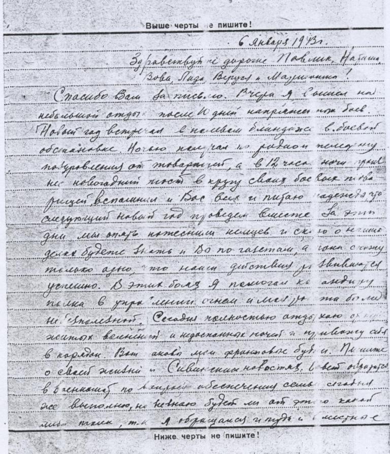 « Новый год встречал в полевом блиндаже в боевой обстановке . Ночью получал по радио и телефону поздравления от товарищей , а в 12 часов ночи произнес новогодний тост в кругу своих боевых товарищей , вспомнил и Вас всех и питаю надежды , что следующий Новый год проведем вместе . За эти дни мы опять потеснили немцев , и скоро о наших делах будете знать и Вы по газетам , а пока скажу только одно , что наши действия развиваются успешно . В этих боях я помогал командиру полка в управлении огнем и работа была небесполезной ».
