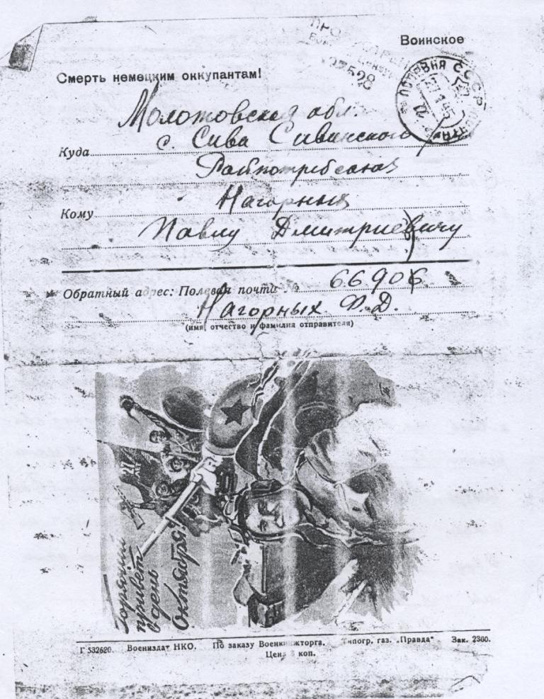 Я перебираю эти письма , давно хранящиеся в папке моей бабули . Некоторые письма в конверте , но чаще это военные открытки , на одной стороне короткий адрес : Молотовская область , с . Сива , Нагорных Павлу Дмитриевичу , на другой – лозунг « Смерть немецким оккупантам !» и печать Полевая почта № 1673, на многих письмах штемпель « просмотрено военной цензурой ».