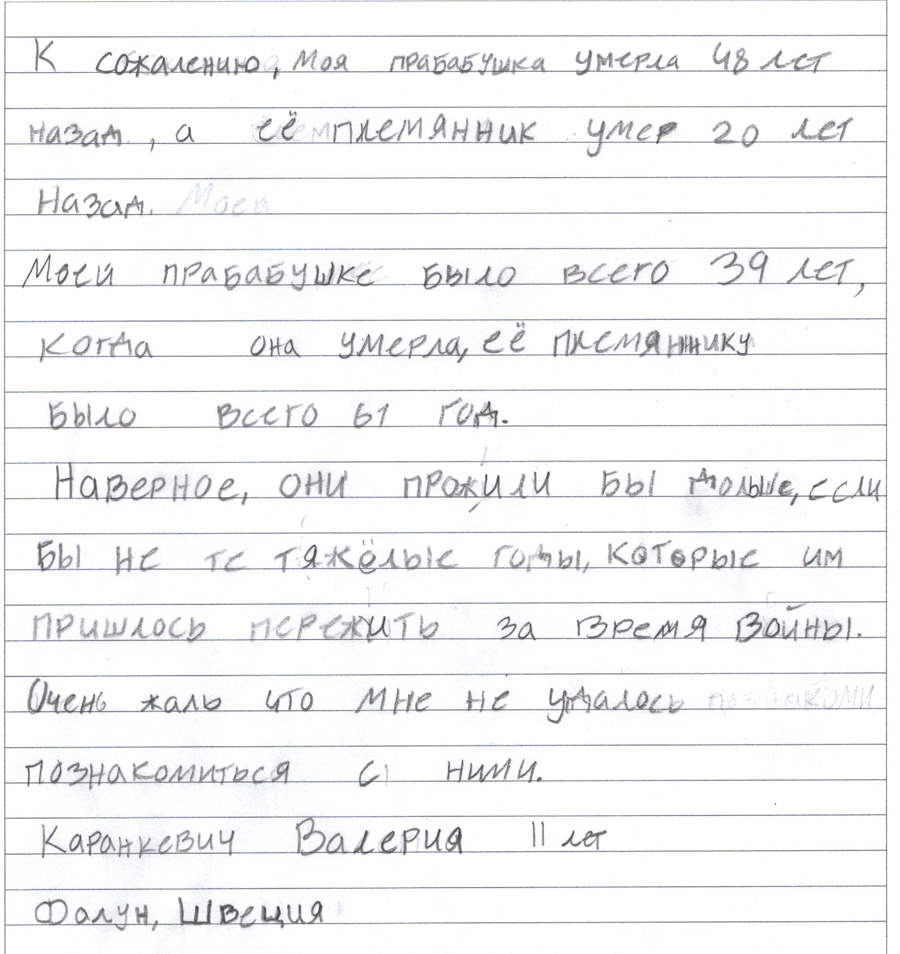 Валерия Каранкевич, 11 лет, Фалюн, Швеция. Победа через судьбы близких