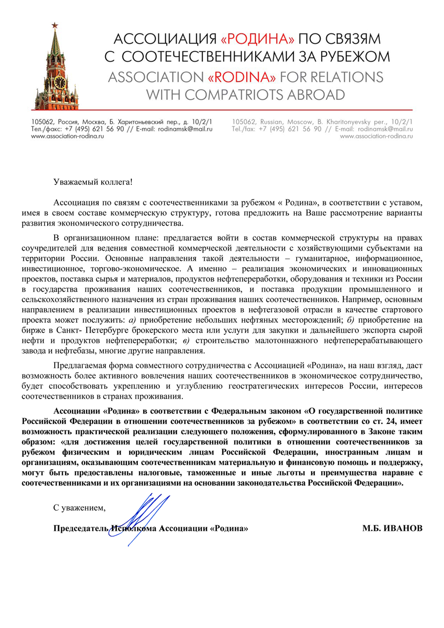 Ассоциация по связям с соотечественниками за рубежом « Родина», в соответствии с уставом, имея в своем составе коммерческую структуру, готова предложить на Ваше рассмотрение варианты развития экономического сотрудничества.