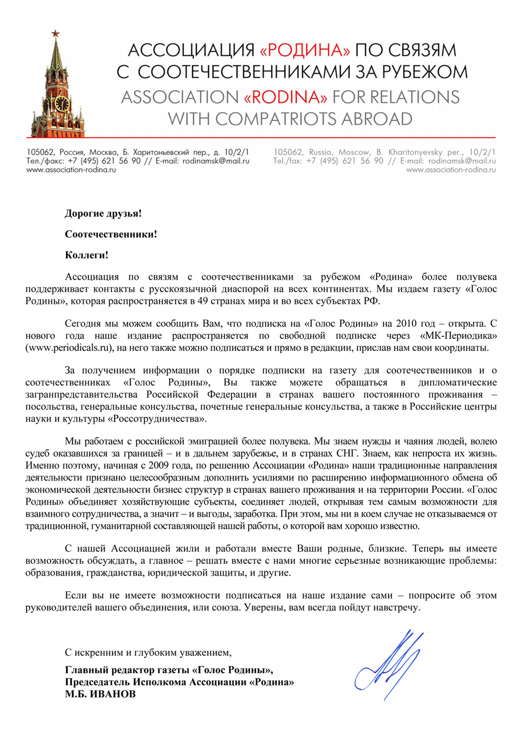 Призыв о подписке на газету “Голос Родины“ в прикрепленном pdf-файле.