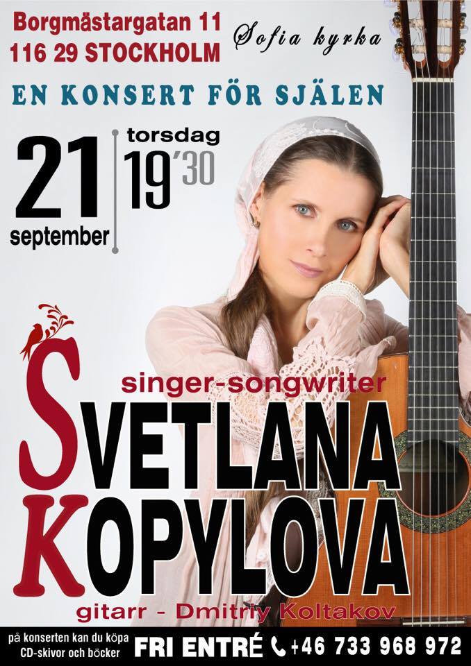 Приглашаем Вас на единственный концерт Светланы Копыловой в Стокгольме, который состоится в 19.30 в четверг 21 сентября в Sofia kyrka.