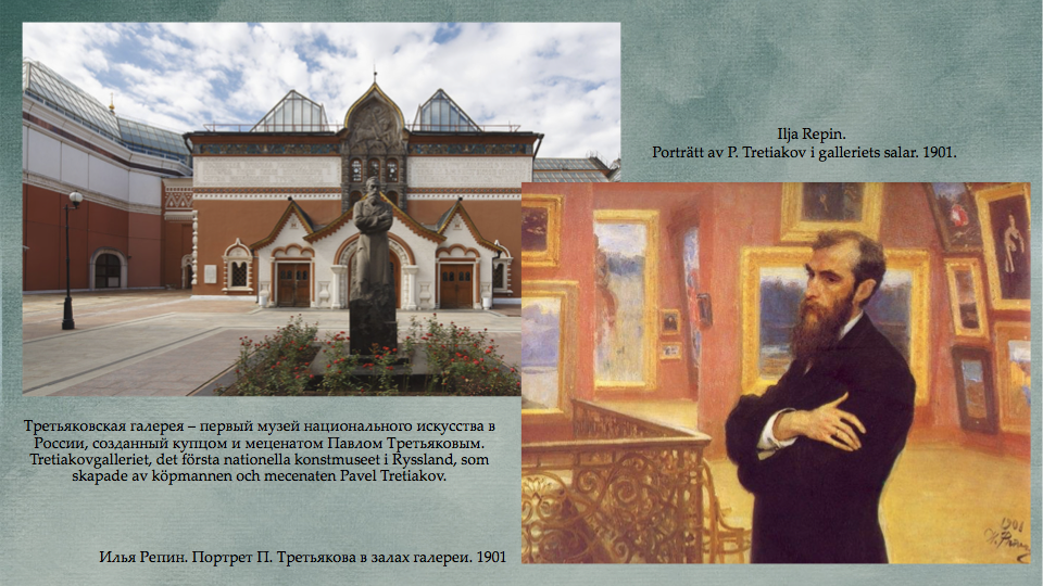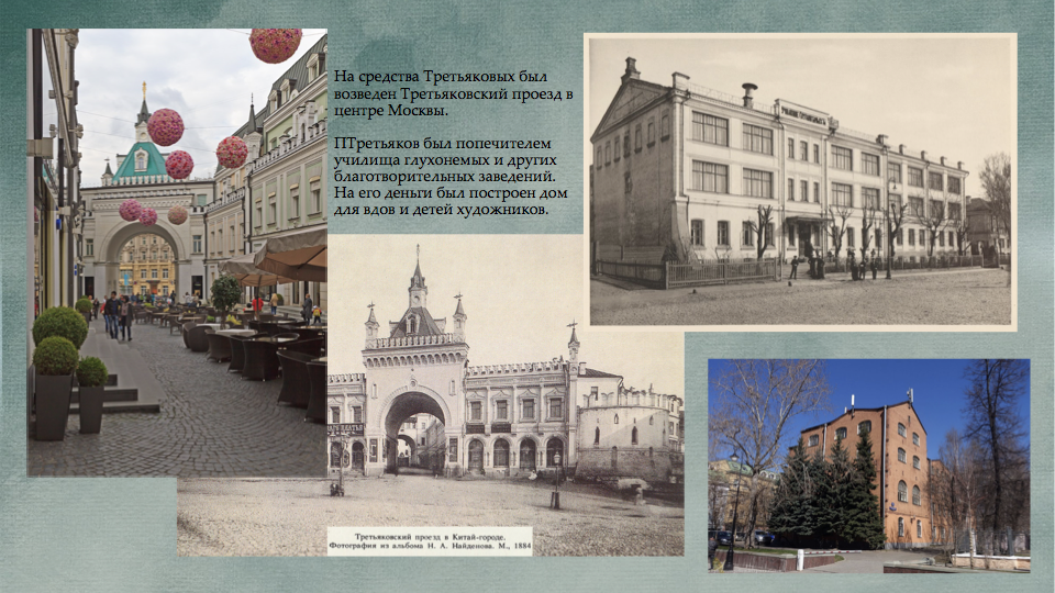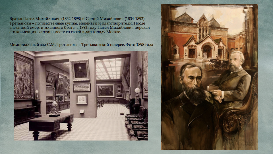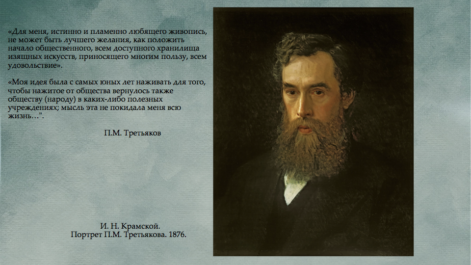 Лучший портретист XIX века, Крамской, написал портрет Третьякова, который перед нами на экране. Он делал свое дело очень тихо и скромно, он не ждал ни награды от царя, ни благодарности от людей, не дожидался спонсоров, просто делал то, что он любил и считал нужным, и подарил в конце своей жизни прекрасный музей Москве, всей России, и всем людям, которые сегодня туда приезжают.