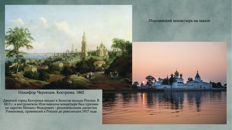 Бизнес братьев Третьяковых был создан в старинном русском городе Кострома. На экране слева картина одного из художников романтической эпохи, который изображает этот старинный город России, а справа самый знаменитый комплекс этого города – Ипатьевский монастырь. В наше время Кострома входит в «Золотое кольцо» России – главный туристический маршрут по древним городам со знаменитыми церквями, фресками и резными деревянными зданиями.