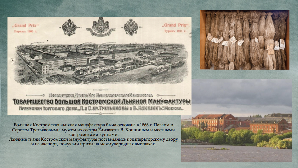 Братья Третьяковы вместе со своим ближайшим родственником – зятем, мужем одной из сестер, основали там льняную фабрику. Льняные фабрики уже были в России на то время, но Костромская мануфактура стала самой масштабной и успешной. Общительный и открытый младший брат Сергей легко заводил связи, в том числе, за рубежом, находил там поставщиков и покупателей, а старший брат, Павел, занимался бухгалтерией и стратегией развития. Льняные ткани Третьяковых поставлялись за рубеж, к императорскому двору и находили очень много благодарных покупателей по всему миру.