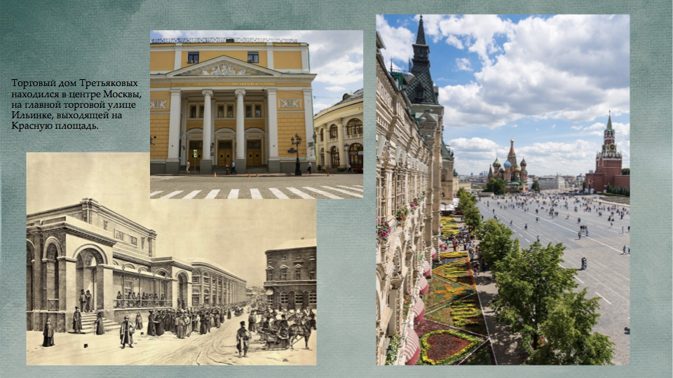 Именно доходы от этого бизнеса позволяли Третьяковым покупать картины для своей коллекции. Торговый дом Третьяковых – Торговый дом льняных тканей, находился в самом центре Москвы, на улице Ильинкe, которая ведет на Красную площадь и к Кремлю. Это древняя торговая улица, она начинается, как видно на фото, у Красной площади, за собором Василия Блаженного. Каждый день в определенный час москвичи видели Павла Третьякова, который подъезжал на повозке к своему Торговому дому, по нему, как говорят, можно было проверять часы.