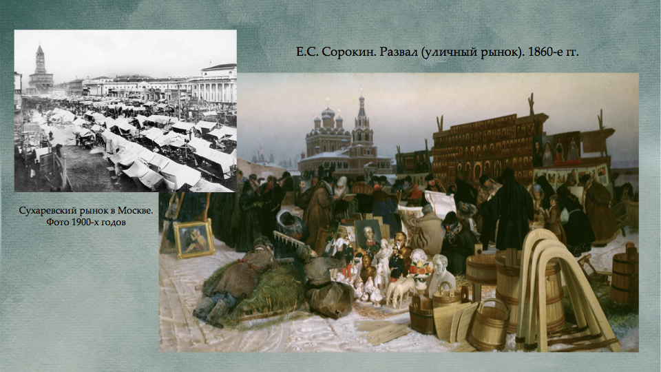 В середине XIX века рядовой москвич, если он хотел украсить картиной или иконой свой дом, покупал эти произведения на обычном рынке. Один из таких уличных рынков изображен в картине Сорокина «Развал». Ныне эта картина находится в Третьяковской галерее. Видно, что рядом на лотках находятся глиняные игрушки, бюсты Пушкина, Наполеона, целые иконостасы – все оформление для церкви, портреты знаменитых полководцев. Тут же и конская сбруя, и многие другие вещи.