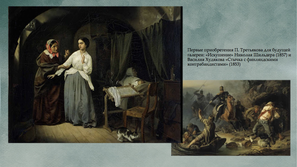 На экране две первые картины, которые Третьяков приобрел непосредственно у художников – именно они стали началом коллекции Третьяковской галереи. Картина Василия Худякова справа называется «Стычка с финляндскими контрабандистами». В это время контрабанда стала очень большим бедствием. Финляндия входила в состав России, и через финскую границу шел большой поток контрабандных товаров, который наносил большой ущерб и бизнесу Третьякова, так как товарные знаки тоже подделывали. Правительство было вынуждено создать буквально боевые отряды таможенников, которые вступали в поединки с хорошо вооруженными контрабандистами.