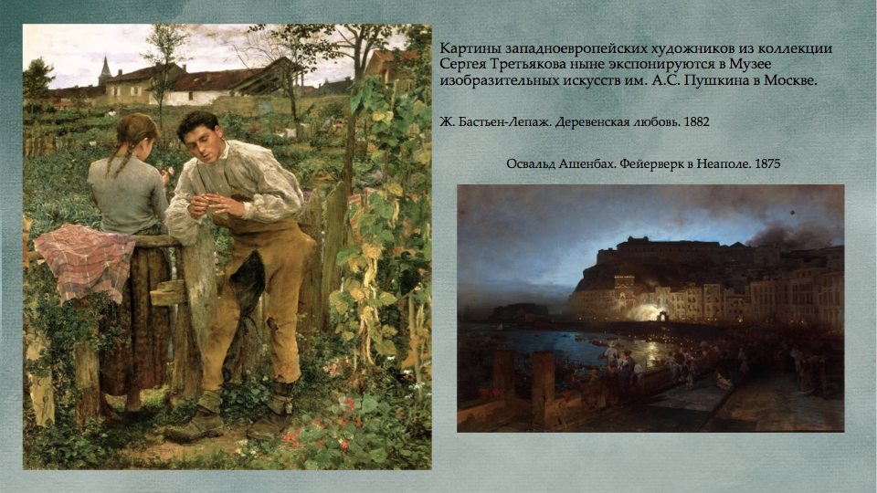 Младший брат Сергей, наряду с русскими произведениями, собирал и западноевропейские, и картины из его коллекции сегодня находятся в другом музее – Музее западноевропейского искусства, который носит имя Пушкина. Самая любимая зрителями картина из его коллекции из Пушкинского музея – «Деревенская любовь» Бастьен-Лепажа, расположенная слева на экране.