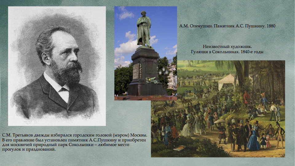 Сергей Михайлович два раза выбирался главой города Москвы – тогда эта должность была выборной – и в его правление было сделано очень много памятных дел, в том числе, установлен памятник Пушкину в центре Москвы. Также, он настоял, чтобы московское правительство купило парк «Сокольники» для москвичей, который по сей день является любимейшим местом для прогулок как для взрослых, так и для детей.