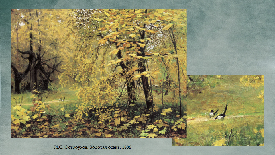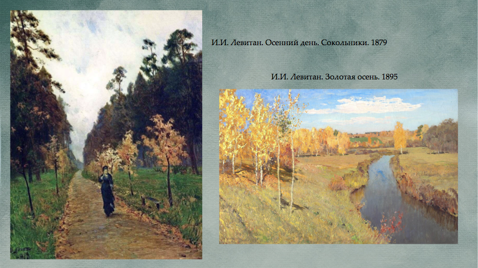Исаак Левитан – родоначальник лирического пейзажа в русской живописи. Он почти никогда не изображает людей в своих пейзажах, сами краски природы говорят о чувствах художника. Фигурку взволнованно идущей по аллее девушки в картине Левитана написал Николай Чехов, брат знаменитого писателя Антона Чехова. Самая знаменитая картина Левитана написана на тему осени, того прекрасного периода, когда деревья покрыты золотыми листьями – «Золотая осень», как ее называют в России.