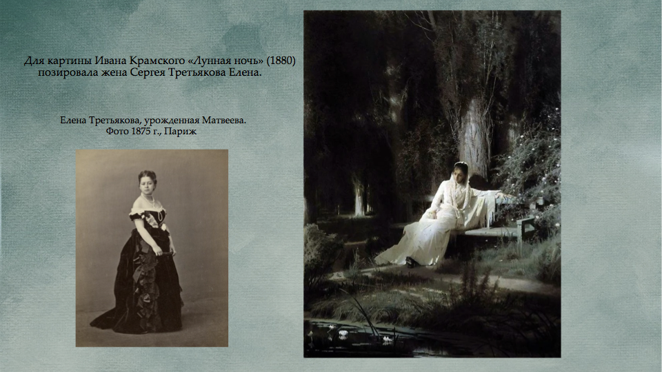 Некоторые картины из русской коллекции Сергея Михайловича Третьякова также находятся в Третьяковской галерее, среди них любимая зрителями «Лунная ночь» Ивана Крамского, картину которого мы недавно видели на экране. Мы не видим луну на небе, но романтика лунной ночи передана через фигурку девушки – именно она здесь, кажется, излучает таинственный ночной свет.