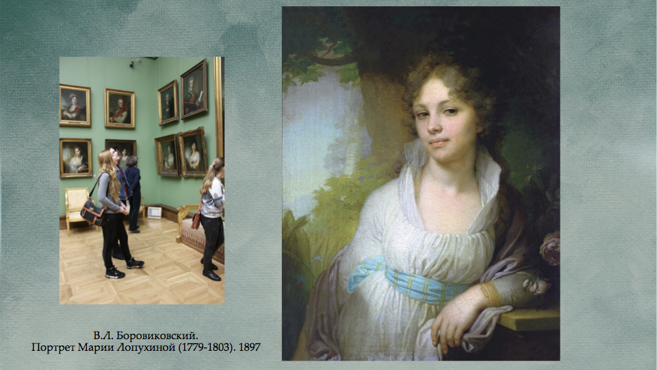 XVIII век в русском искусстве называют «веком портрета», и перед нами портрет Марии Лопухиной художника Боровиковского. Боровиковский впервые в русской живописи стал изображать своих героинь среди природы. Портрет написан по случаю скорой свадьбы Марии Лопухиной, жених заказал ее портрет художнику. На портрете ей восемнадцать лет, к сожалению, прожила она всего двадцать четыре года – ее унесла чахотка. Лопухина – ее фамилия по мужу, сама она происходит из рода Толстых, и писатель Лев Толстой тоже ее дальний родственник.