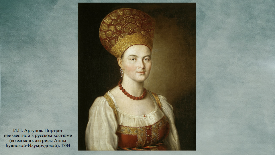 Еще один знаменитый портрет из коллекции Третьяковской галереи, это произведение художника Аргунова из крепостных крестьян, он принадлежал знаменитому роду Шереметьевых, знаменитому дворянскому роду. Прекрасная женщина на портрете изображена в подлинном народном костюме московской губернии. Историки искусства предполагают, что здесь может быть изображена актриса крепостного театра Шереметьевых, Анна Буянова-Изумрудова, которая играет какую-то народную роль.