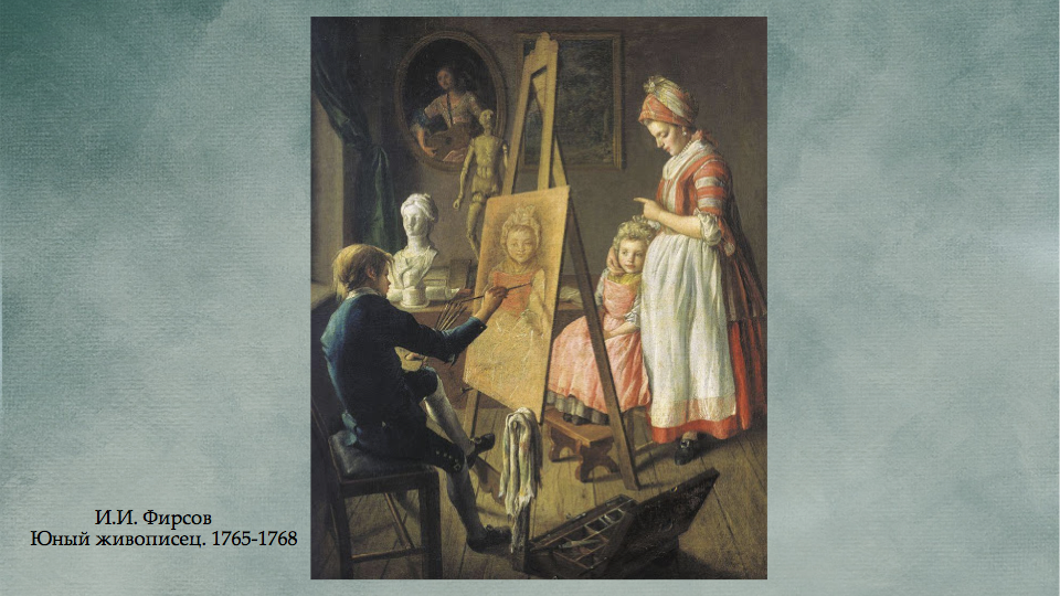 Чудесная картина Ивана Фирсова изображает юного художника, который учится писать портреты. Он пишет портрет своей младшей сестренки, которой, вероятно, четыре-пять лет. Ей тяжело сидеть и позировать, хочется побегать и поиграть. Мама одной рукой ласково гладит ее по щечке, а другой грозит рукой, призывая к порядку. Портрет еще только начат, но видно, что он очень похож, и то, с какой нежностью и любовью брат пишет портрет своей младшей сестренки.