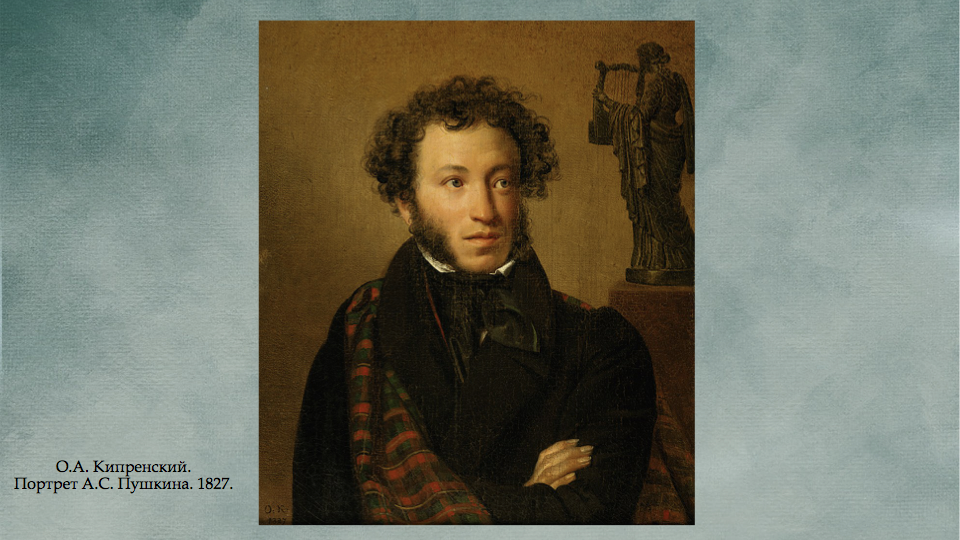 Портрет Александра Сергеевича Пушкина, знаменитого русского поэта, заказал его одноклассник и друг его юности, Антон Дельвиг, также прекрасный поэт Пушкинской эпохи. Автор портрета – самый яркий художник эпохи романтизма в России – Орест Кипренский. Кипренский сказал о своем портрете: «Я написал портрет гения». Пушкин окружен золотым светом, позади находится статуэтка музы. Пушкин сделал ответный подарок художнику – написал стихотворение в его честь. В этом стихотворении он написал «Себя как в зеркале я вижу, но это зеркало мне льстит».