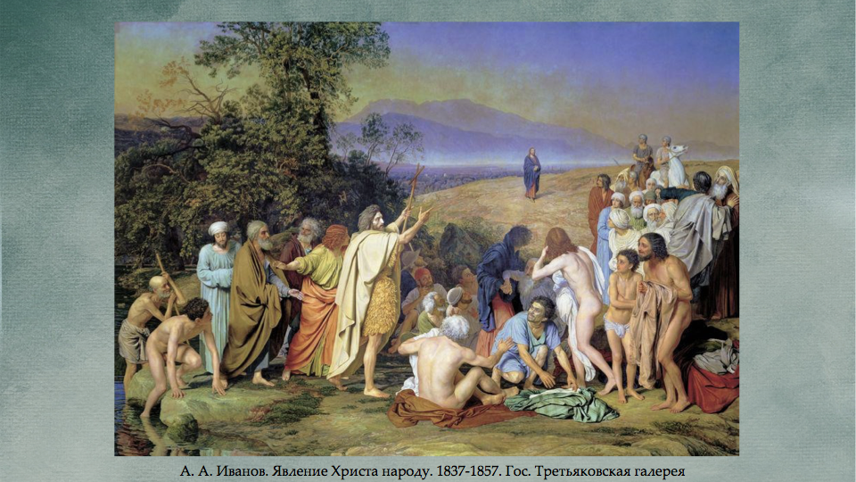 В картине взят сюжет из Евангелия, когда Иисус Христос является на реке Иордан, где Иоанн Креститель крестит людей в это время. Все художники до Иванова, русские и западноевропейские, изображали в этой сцене только две фигуры – Иисуса Христа и Иоанна Крестителя, который его крестит, иногда еще в этой сцене присутствовали ангелы. Иванов впервые изобразил в качестве главного героя народ, который ждет своего Спасителя, Сына Божьего.