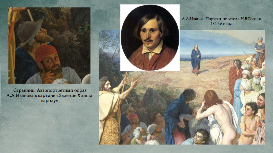 Для одного из персонажей картины позировал знаменитый русский писатель Николай Гоголь, перед нами его портрет, который Иванов написал в Италии. В картине он ближайший к Христу, он оглядывается, словно выходя из толпы навстречу Спасителю.