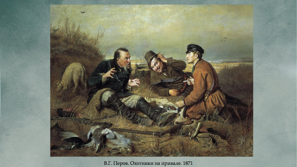 Во второй половине XIX века художники обращаются к сюжетам из реальной жизни. Один из таких художников – Василий Перов. В картине «Охотники на привале» он изображает компанию из разных социальных слоев общества: слева дворянин, представитель древнего знатного рода, который рассказывает какую-то байку, его добыча «увеличивается» с каждой минутой; в центре его бывший крепостной крестьянин, его слуга, который теперь уже свободен, но остался со своим хозяином, он знает цену этим рассказам, дополняемым с каждым разом. Справа новенький в этой компании – небогатый горожанин, ремесленник или служащий в трактире. Он пока еще верит каждому слову, смотрит широко открытыми глазами, забыл прикурить сигарету, и пока еще принимает все за чистую монету.
