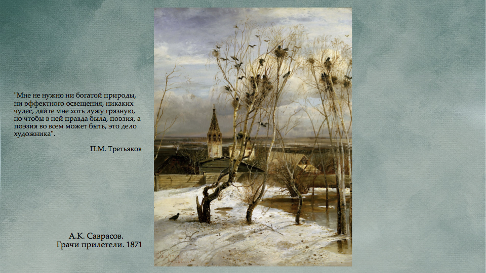 «Грачи прилетели» - так называется картина на тему весны Алексея Саврасова. До Саврасова пейзажисты стремились писать красивые виды природы, похожие на Италию, на жаркие страны. Саврасов впервые взял не эффектный, но очень душевный русский мотив. Он изобразил самое начало весны, когда зима еще не хочет уходить, но появление грачей означает, что весна все-таки вступает в свои права.