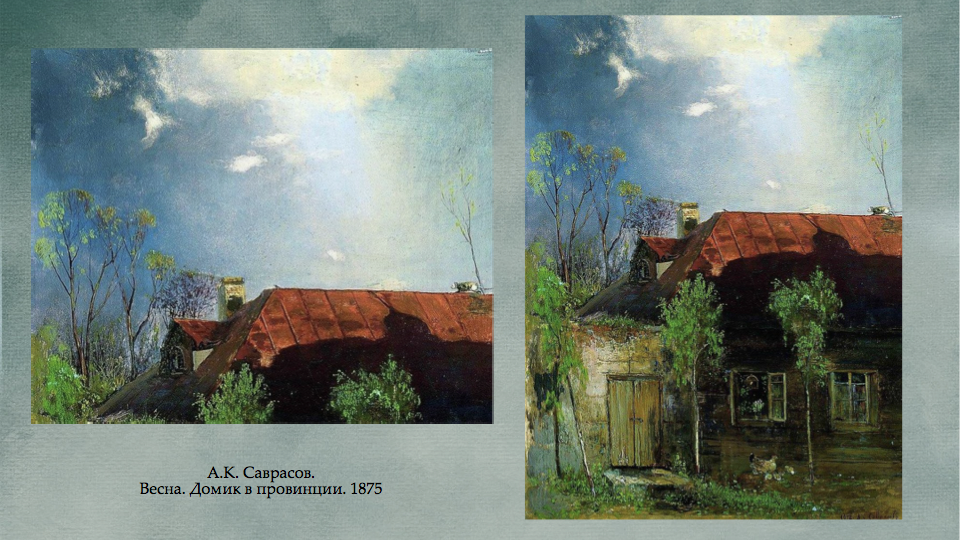 Если Исаак Левитан – поэт осени, то Саврасов любит писать именно весну. В картине «Домик в провинции» художник пишет май: зазеленевшие березы, открытое окно маленького дома, где на подоконнике стоят клетка с канарейкой и ландыши. Под окном курочка с цыплятами, а по крыше крадется кошка. На самом кончике крыши видна маленькая птичка. Сквозь тучи пробивается солнечный свет, и тень на крыше показывает, что совсем рядом находится церковь – угадываются ее купол и крест.