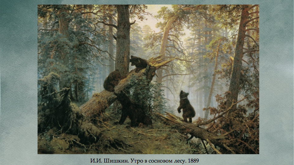 Любимая картина всех посетителей галереи – «Утро в сосновом лесу» Шишкина. Шишкин родился в лесном краю, где бескрайние леса были на много километров вокруг. Он любил там гулять с самого детства.