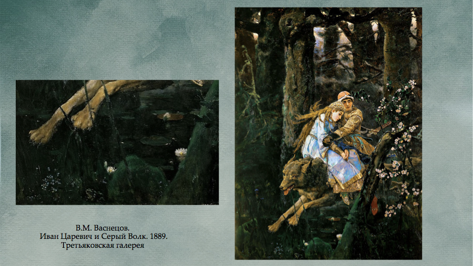Картина Васнецова на тему русской народной сказки «Иван Царевич и Серый Волк». Волк, говорящий человеческим голосом, помогает Ивану Царевичу добыть сказочные сокровища, в том числе царевну Елену Прекрасную. Они скачут на волке сквозь темный заколдованный лес, под ногами у них болото.
