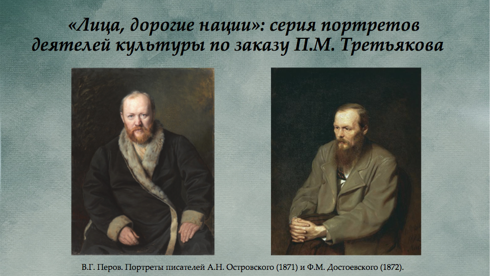 Василий Перов, чью картину «Охотники на привале» мы уже видели, создал портреты писателей Александра Островского и Фёдора Достоевского. Островский писал свои пьесы о купеческой Руси; в портрете он изображён в купеческом халате на меху, и лишь острый взгляд его глаз выдаёт в нем не купца, а писателя. Портрет Достоевского написан очень скупыми красками, но в портрете ощущается его напряженная мысль о судьбе России, о нравственных проблемах.
