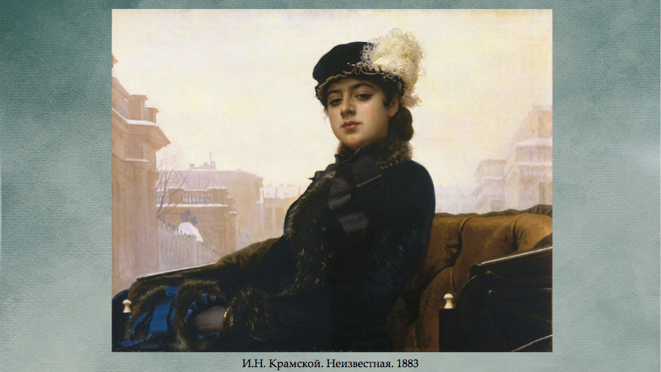 Одна из самых знаменитых картин Крамского называется «Неизвестная». Крамской создал такой убедительный образ красавицы, что до сих пор все строят гипотезы, кто изображён в этом портрете. Но, на самом деле, он создал собирательный образ, поэтому эту загадку нельзя разгадать, но она привлекает всех зрителей к этому портрету так же, как красота героини.