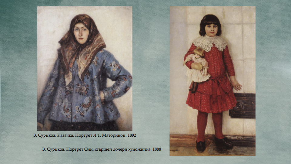 Суриков писал прекрасные портреты своих соотечественников-сибиряков, так как он был родом из Сибири, из сурового северного края. Его портрет Маториной слева, это образ богатырской силы, красоты и верности своим идеалам. Справа портрет старшей дочери Сурикова, Ольги, которая вышла замуж за художника-авангардиста Кончаловского, и от этого пошла династия знаменитых режиссеров: Андрон Кончаловский и Сергей Михалков – их потомки.