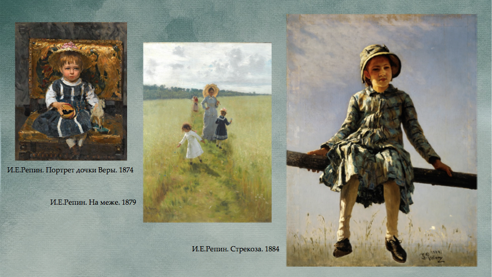 Знаменитый современник Сурикова, Илья Репин, также писал множество детских и семейных портретов. Во всех портретах, представленных на экране, изображена его любимая старшая дочка Вера; в центре ещё его жена и дети на фоне солнечного пейзажа, почти как у импрессионистов.
