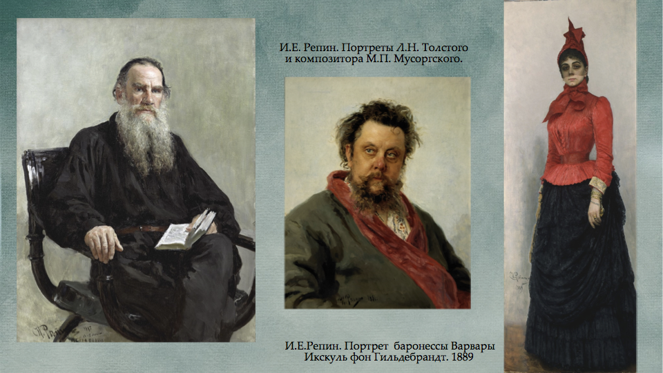 По заказу Третьякова и по собственному желанию Репин также писал портреты деятелей русской культуры. Перед нами портреты Льва Толстого, знаменитого композитора Мусоргского, и справа портрет знаменитой красавицы, баронессы Варвары Икскуль фон Гильдебрандт. В этом портрете она похожа на средневековую принцессу.