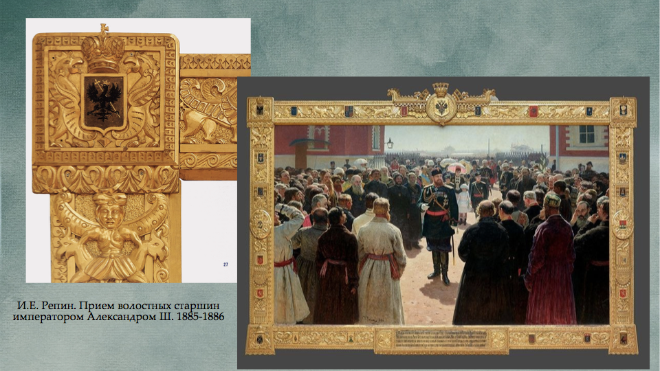 В картине изображено вступление на престол императора Александра III и представители крестьян, которых он, впервые в истории России, позвал на свою тронную речь. У картины особенно роскошная рама, ее делали царские ювелиры, она украшена гербами тех городов, откуда пришли представители крестьян на это мероприятие; узоры на раме – это реплики из древнерусских рельефов и рукописей.