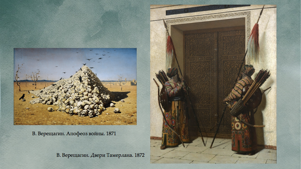 Художник Василий Верещагин не только писал картины, но и воевал с оружием в руках. Он был профессиональным морским офицером. В своих картинах он впервые изображает жестокую правду о войне.
