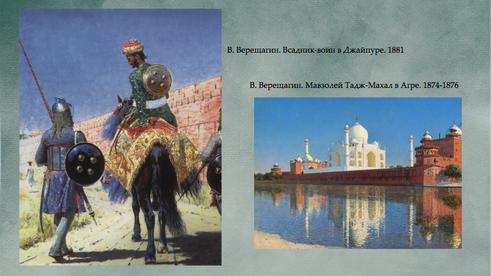 И во время войны, и в перерывах между войнами, он много путешествовал по миру, в том числе дважды совершил длительные путешествия в Индию. Его картины воссоздают прекрасные образы воинов в традиционных одеждах, самый впечатляющий памятник – Мавзолей Тадж-Махал и другие, сказочные для нас, детали индийской жизни.