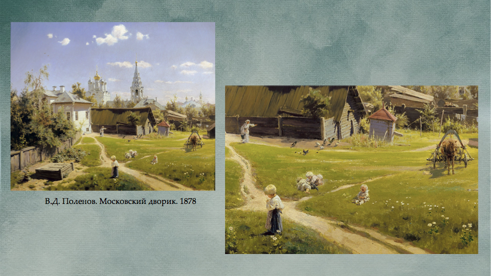 Один из любимых зрителями пейзажей в Третьяковской галерее – «Московский дворик» Поленова. Здесь изображён самый центр Москвы, Москву в старину называли «большой деревней», в ней было много просторных двориков, домов, сараев, речек, ручейков, где было привольно расти детям. На первом плане маленькая девочка гадает на ромашке, плачет ребёнок – мама на минутку отошла; двое мальчишек на траве играют с котиком. Во всем пейзаже ощущаются тепло и уют.
