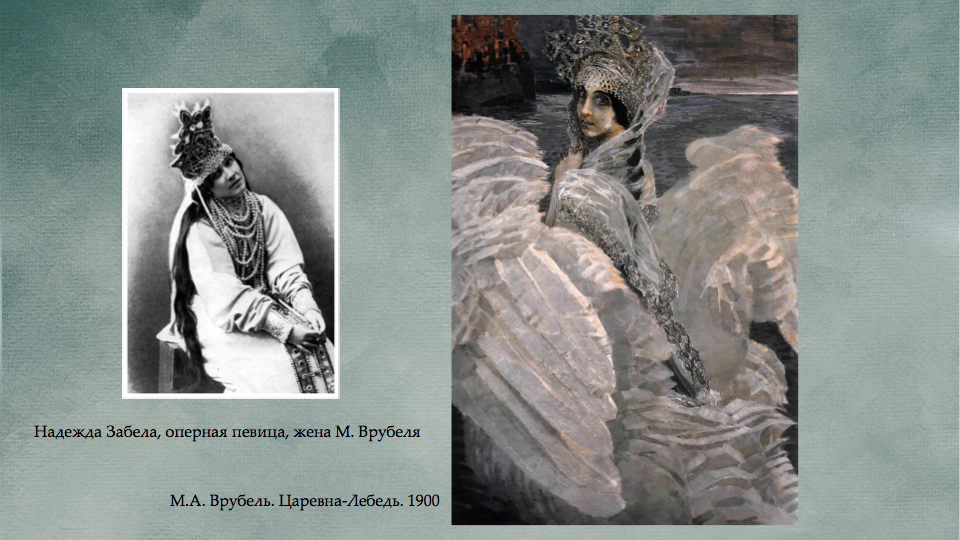 Его «Царевна-Лебедь» – это и образ из сказки Пушкина, и сказочный портрет его жены Надежды Забелы, оперной певицы. Она исполняла роль Царевны-Лебеди в опере по сказке Пушкина. Врубель сам сочинял театральные костюмы для своей жены.