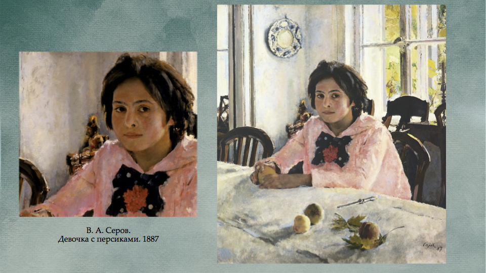 «Девочка с персиками», картина Валентина Серова, изображает дочку мецената Саввы Мамонтова, владельца усадьбы «Абрамцево». В усадьбе «Абрамцево» бывали и Васнецов, и Левитан, и Врубель, и Репин – все художники старшего и младшего поколения.