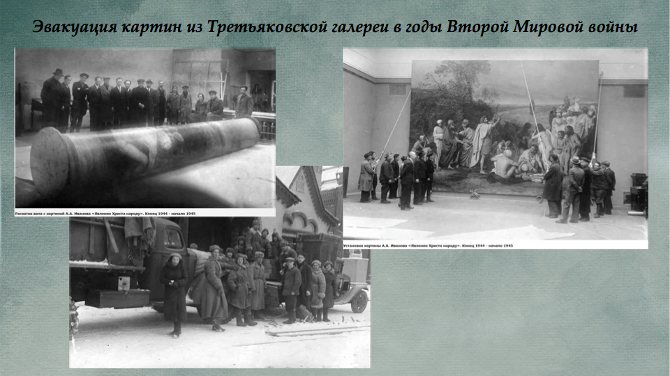 В годы Второй Мировой войны, когда бомбили Москву, все картины Третьяковской галереи были эвакуированы в Сибирь. На фотографии слева видно, как самую большую картину «Явление Христа народу» накатывают на вал и как ее возвращают обратно в зал галереи. Здание галереи пострадало от бомбежек, но все картины удалось сохранить, и они вернулись назад.