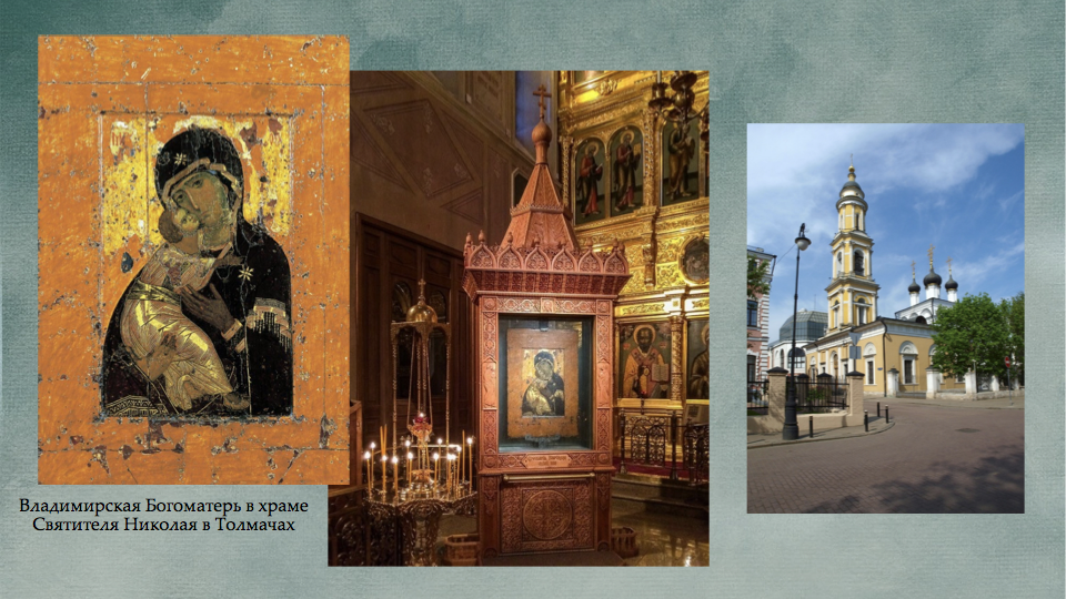 Уже в XX веке появилась экспозиция иконописи в Третьяковской галерее. Самая знаменитая икона Владимирская Богоматерь находится в храме Св. Николая при галерее.