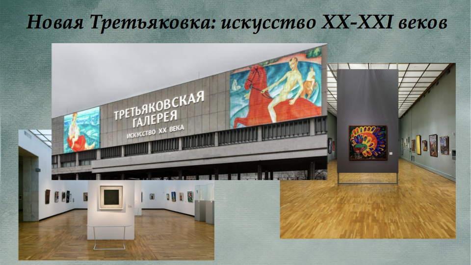 Искусство XX и XXI века представлено в отдельном здании, которое называется «Новая Третьяковская галерея». Оно было построено в середине XX века. Там находятся знаменитые шедевры авангардного искусства: «Чёрный квадрат» Малевича, картины Кандинского, «Купание красного коня» Петрова-Водкина – мы видим эту картину на фасаде галереи.