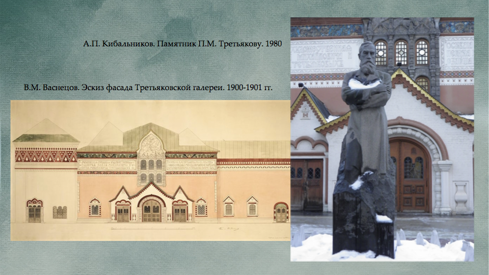 Уже в начале XX века вход в это здание оформил знаменитый художник, автор сказочных картин – Виктор Васнецов. Вход в галерею выглядит как теремок из русских народных сказок. И перед зданием галереи посетителей встречает памятник Павлу Михайловичу Третьякову – он предстает в своей любимой позе, со сложенными на груди руками, как он встречал когда-то своих гостей.