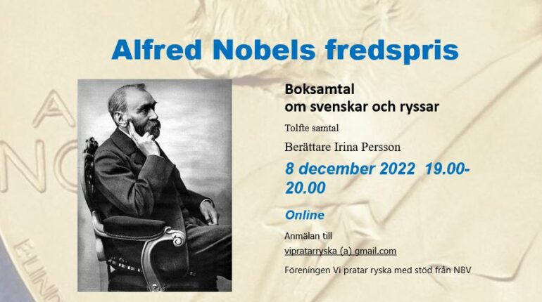 Den 8 december kl.19 berättar bibliotekarien Irina Persson om senaste böcker om Alfred Nobel. Gratis samtal via Zoom, be om länk vipratarryska (a) gmail.com