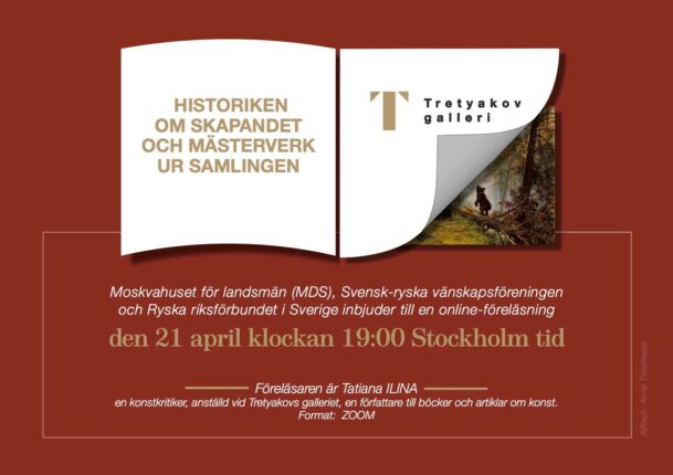 Svensk-ryska vänskapsföreningen, Ryska riksförbundet i Sverige och Moskvahuset för landsmän (MDS) inbjuder dig den 21 april till en online-föreläsning: “Tretyakovs galleri historiken om skapandet och mästerverk ur samlingen”. Föreläsaren är Tatiana Ilina, en konstkritiker, anställd vid Tretyakovs galleriet, en författare till böcker och artiklar om konst. Tatiana Ilina kommer att berätta för deltagarna i den […]