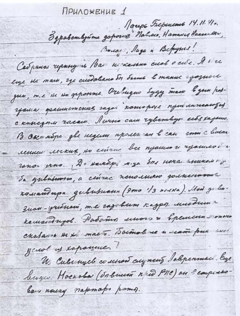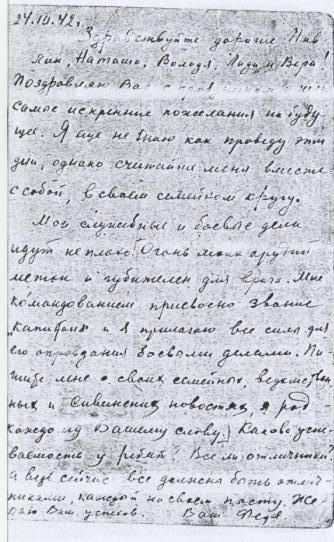 « Я все еще не там , где следовало бы быть . В такие грозные дни . Очевидно , буду там в дни разгрома фашистских гадов , которые приближаются с каждым часом . До ноября месяца был начальником штаба дивизионного , а сейчас исполняю должность командира дивизии ( это 1/3 полка ). Мой дивизион – учебный , т . е . готовит кадры младших командиров . Работы много и времени можно сказать не хватает . Бытовые и материальные условия хорошие ».