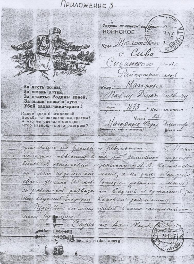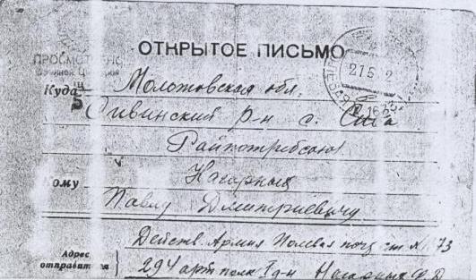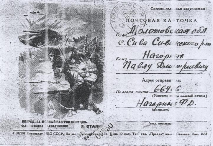 Я перебираю эти письма , давно хранящиеся в папке моей бабули . Некоторые письма в конверте , но чаще это военные открытки , на одной стороне короткий адрес : Молотовская область , с . Сива , Нагорных Павлу Дмитриевичу , на другой – лозунг « Смерть немецким оккупантам !» и печать Полевая почта № 1673, на многих письмах штемпель « просмотрено военной цензурой ».