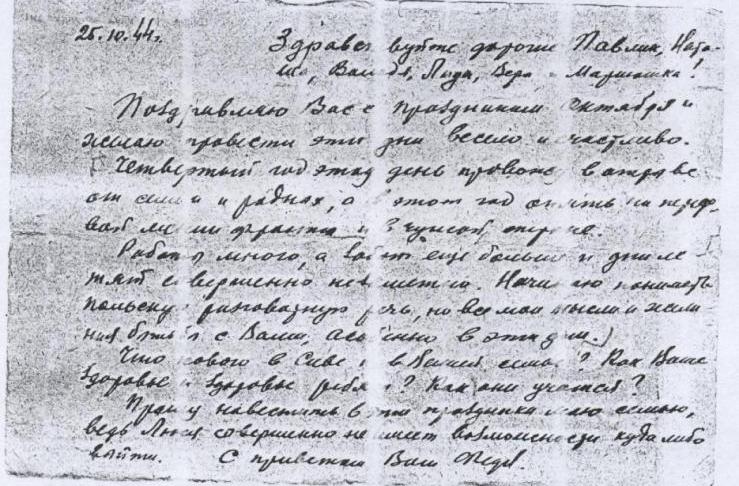 Письмо 16 декабря 1944 года : « Поздравляю Вас с Новым 1945 годом – годом нашей победы над врагом и желаю вам здоровья , счастья в жизни и успеха в работе , а ребятам в учебе . Надеюсь , что следующий Новый год встретим вместе , в кругу своей семьи ».