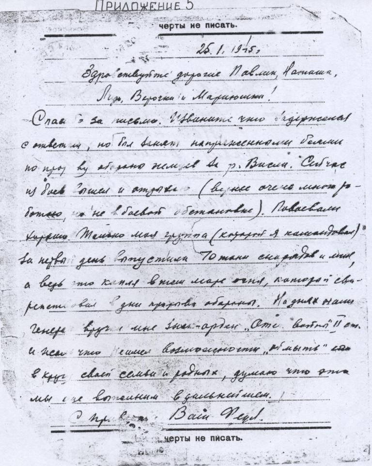 « Был занят напряженными боями по прорыву обороны немцев за р . Висла . Сейчас из боев вышел и отдыхаю ( вернее очень много работаю , но не в боевой обстановке ). Повоевали хорошо . Только моя группа ( которой я командовал ) за первый день выпустила 70 тонн снарядов и мин , а ведь это капля в том море огня , который свирепствовал в дни прорыва обороны . На днях наш генерал вручил мне знак - орден « Отечественной войны » 2 степени , и жаль , что не имел возможности « обмыть » это в кругу своей семьи родных , думаю , что это мы еще выполним в дальнейшем ».
