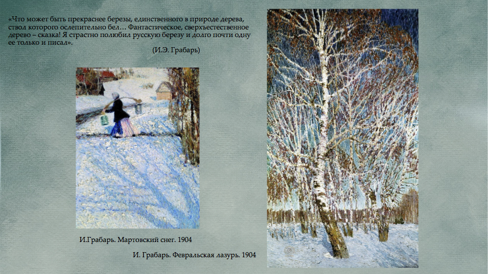 В конце XIX – начале XX века в русском искусстве появляются свои импрессионисты. Прежде всего, это Игорь Грабарь. В отличие от Клода Моне и Ренуара, русские импрессионисты любят писать зиму и русские березы.